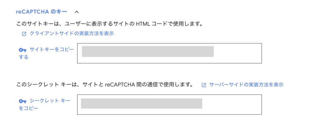 登録が完了すると、サイトキーとシークレットキーが発行されます。